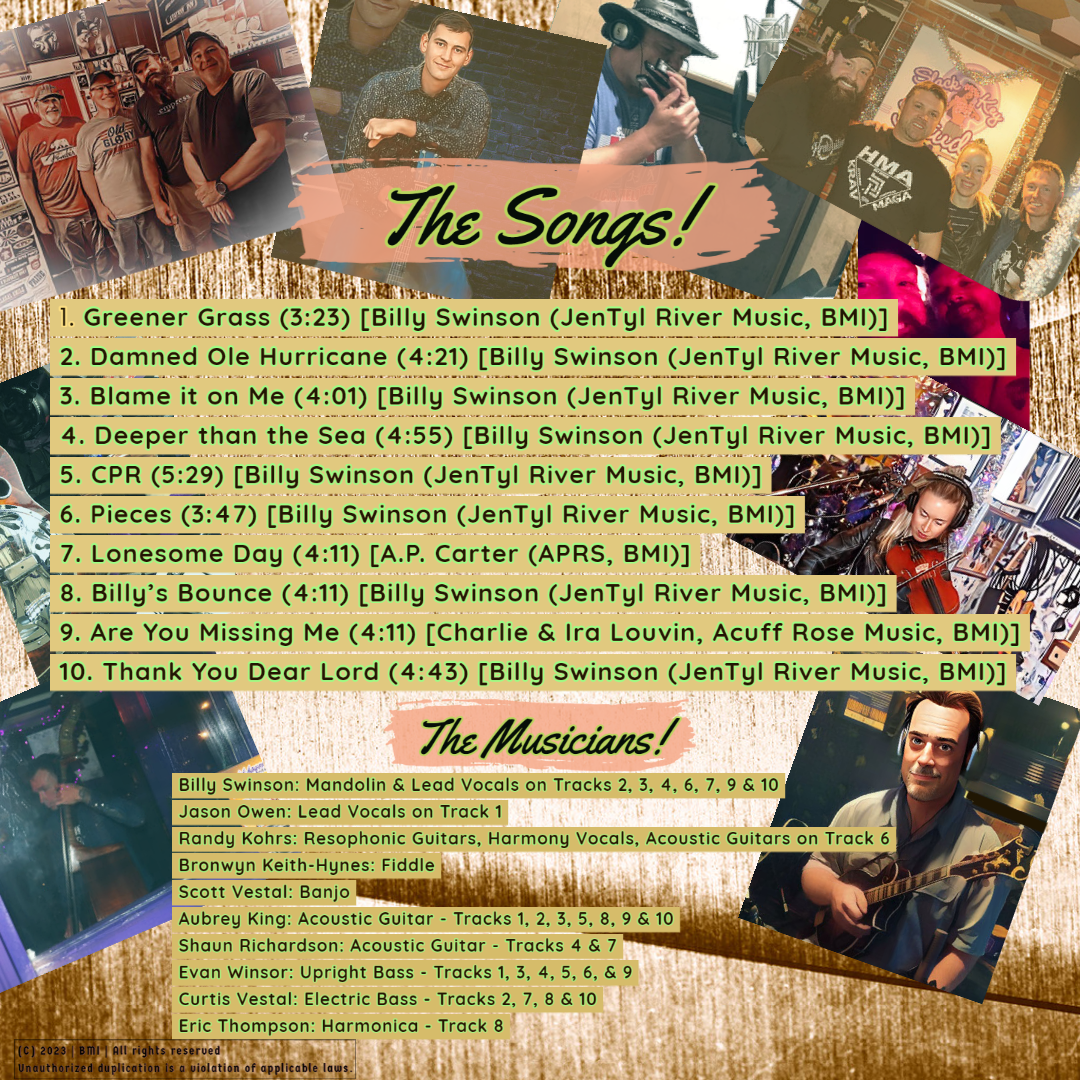 • Billy Swinson on mandolin & lead vocals (Except for the title track Greener Grass)
